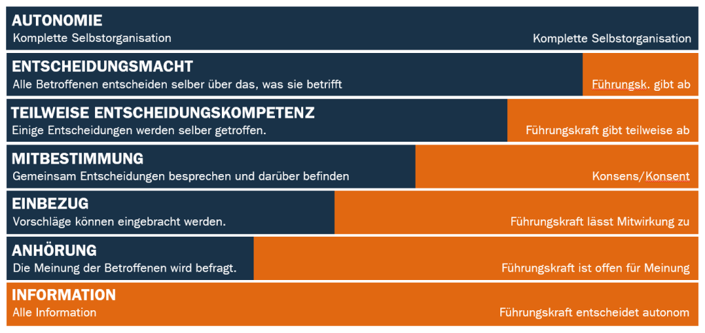 - Stufe 1 (Information): Die Führungskraft entscheidet autonom, informiert aber transparent.